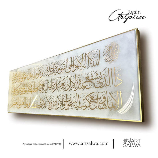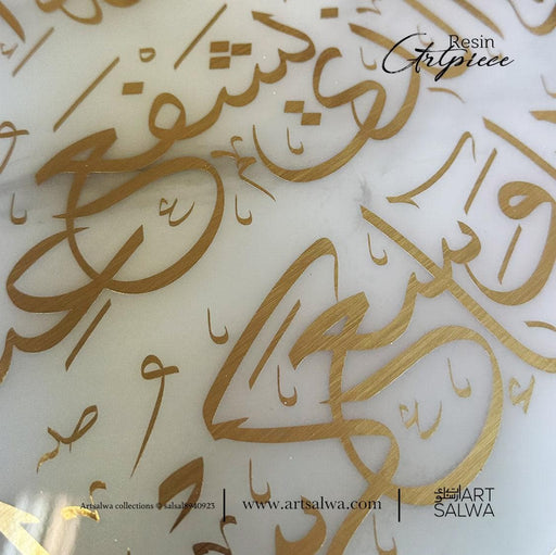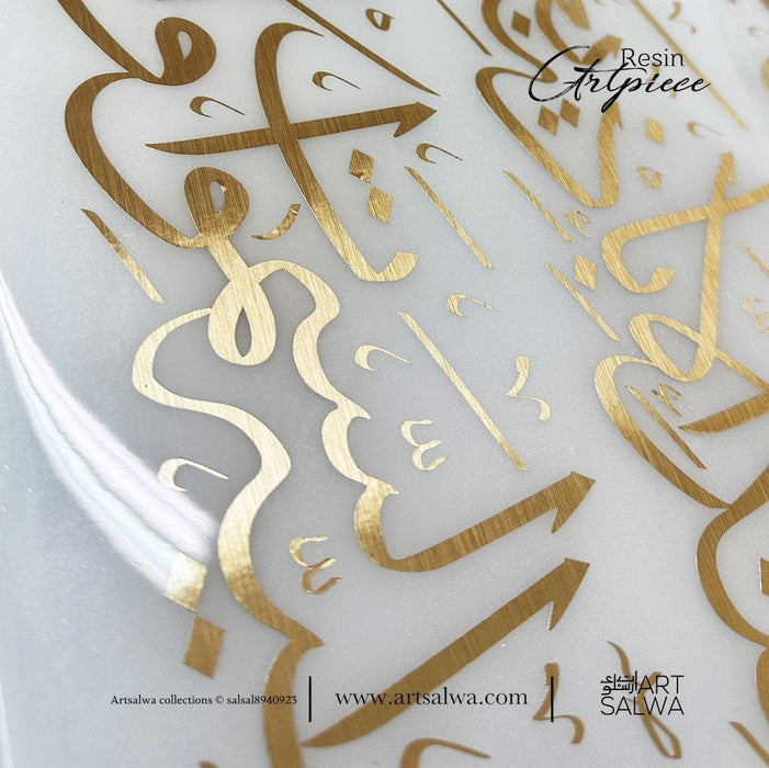 This premium Epoxy Resin Artpiece Concept White Marble is a highly sought-after option among art lovers, offering unparalleled versatility and effortless enhancement for any wall it adorns. The addition of a striking gold Thuluth script adds a refined and sophisticated touch to its already impressive design, making it a must-have for those seeking a touch of elegance in their décor.