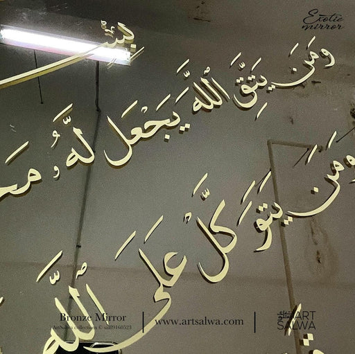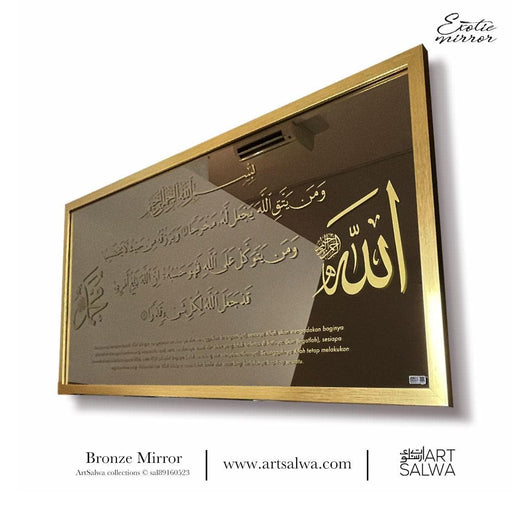 This Surah At Talaq Bronze Mirror Seribu Dinar is a stunning piece of Islamic calligraphy art. The gold frame border enhances its beauty, while the Ayat seribu dinar – a nickname given to verses 2-3 of Surah At Talaq in Rasm Uthmani – provides an easy to recite and to be memorized. A touch of simplicity and grandeur complete the look of this gorgeous bronze mirror.