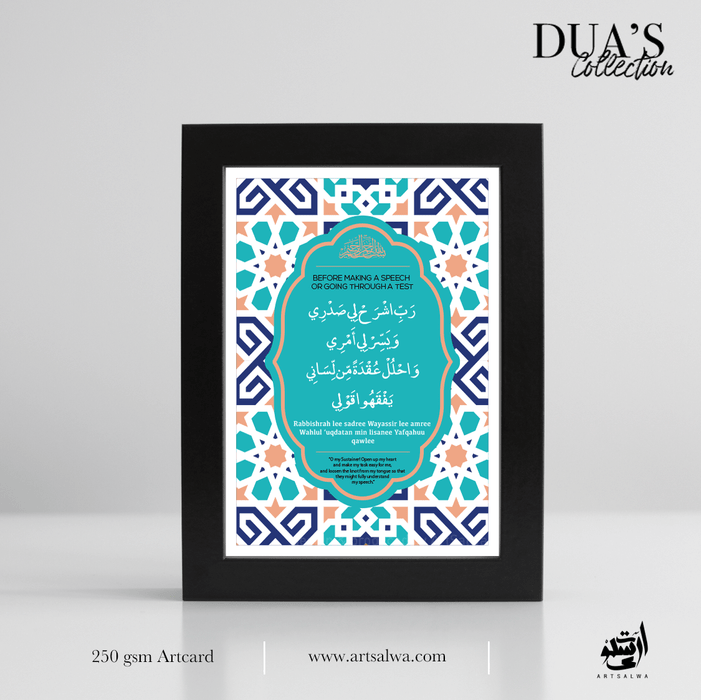 Saiz poskad Duas terdapat sama ada dalam kad seni bersaiz A5 atau dalam siri bingkai lengkap. Sesuai untuk bacaan harian, pindah rumah serta sebarang hadiah majlis khas.