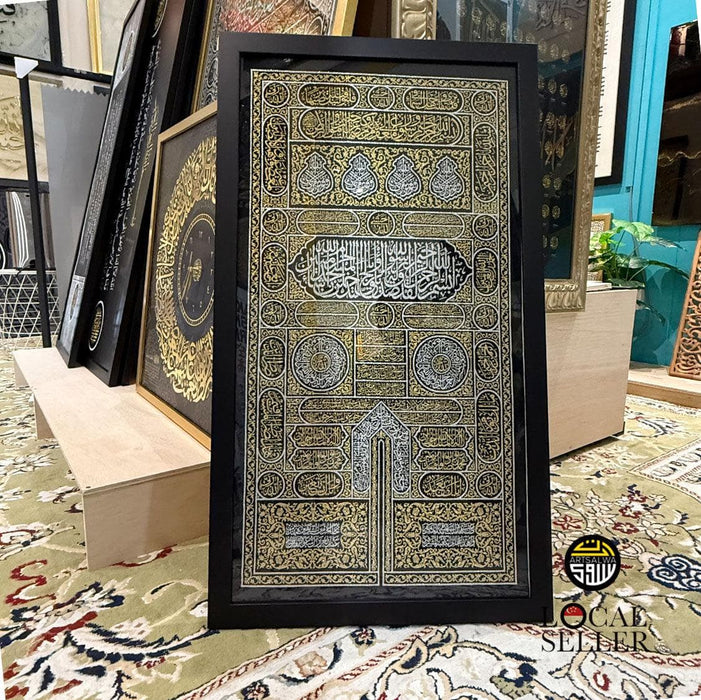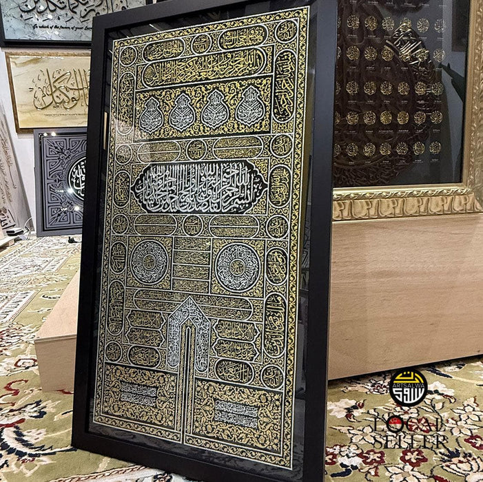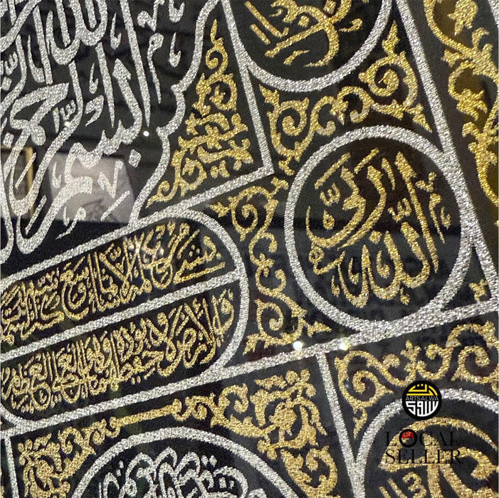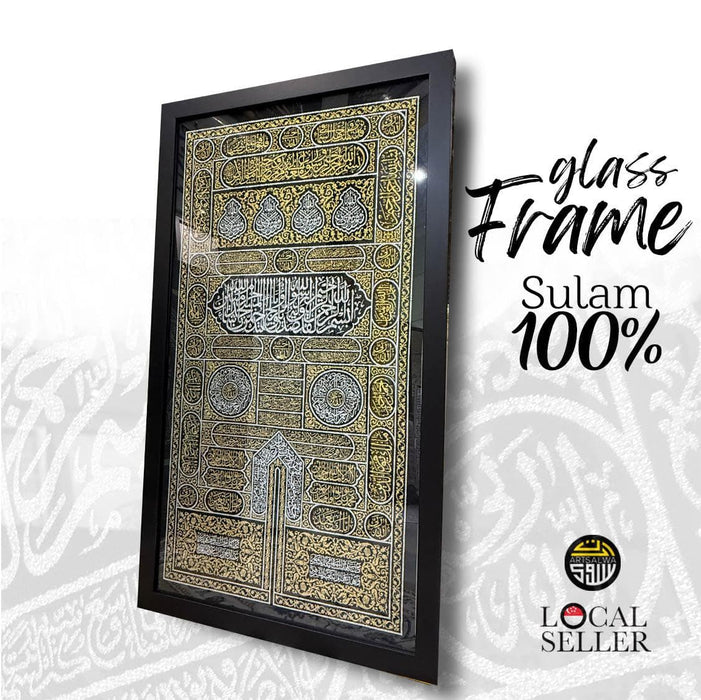 This Kaabah Sitarah Large Border Frame boasts an exquisitely crafted replica of the holy Kaabah door frame, the majestic Kiswah or curtain named Sitarah. Representing Islamic architecture, this frame is sure to add a touch of beauty and elegance to any home or office. This is the printed poster edition in a glass frame. The material is embroidery perfected with gold thread as how we will see it in an actual piece in masjidil haram.